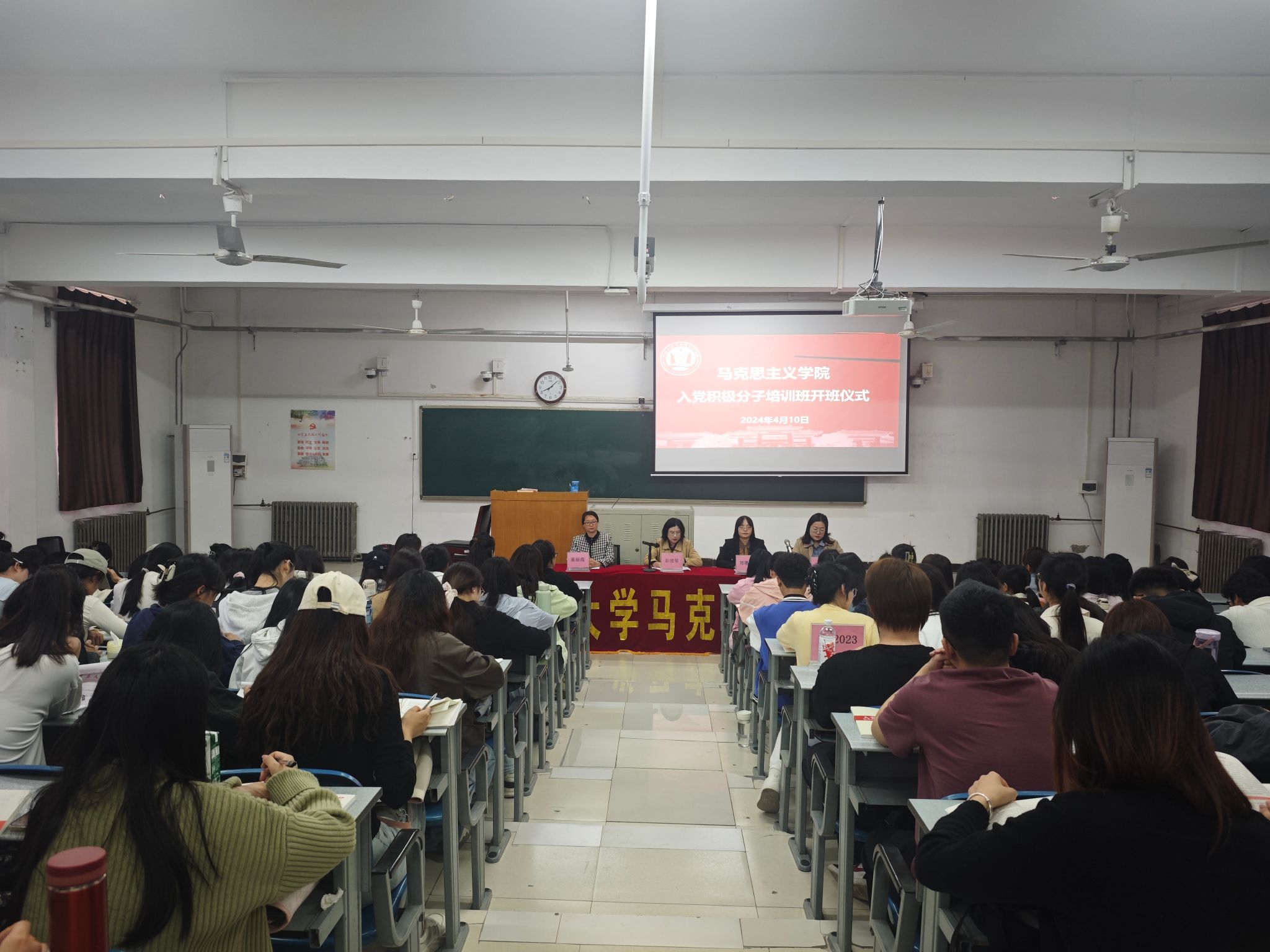 4月10日上午,培训班在明伦校区十号楼128教室举办开班仪式,学院党委书记彭绪琴、党委副书记郑珊珊、党办主任董丽霞、辅导员张洁宜和本期156名入党积极分子学员参会。会议由董丽霞主持。彭绪琴在讲话中表示,希望全体入党积极分子充分认识到此次培训班对提高思想认识、端正入党动机的重要性,要端正学习态度,严守培训纪律,珍惜学习机会,力求在培训中收获知识、提升自我,真正做到学有所思、学有所悟、学有所得,为未来的成长与发展筑牢根基。