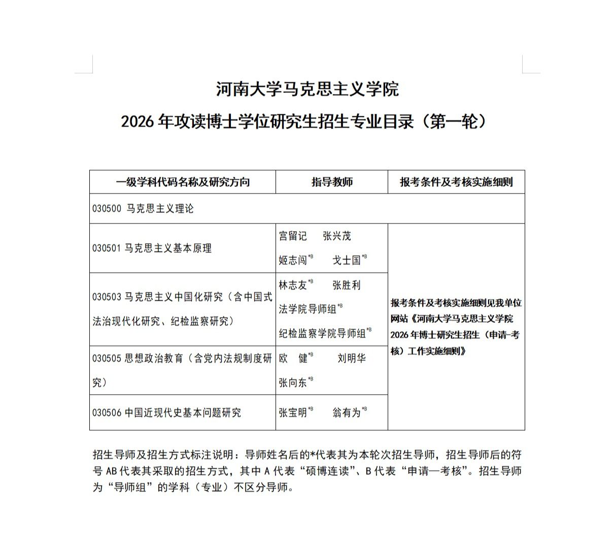 河南大学马克思主义学院2026年博士研究生 (申请-考核)招生工作实施细则 (第一轮)