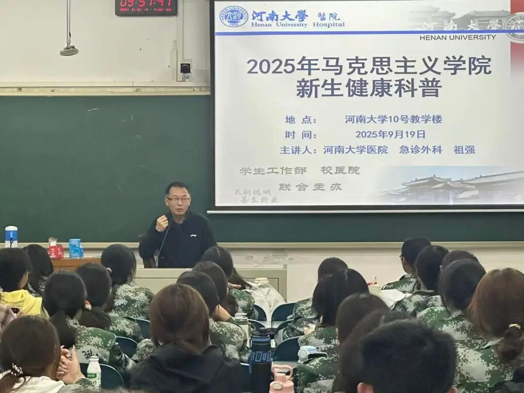 9月19日,校医院急诊外科主治医师祖强对新生进行健康教育。他从健康习惯养成、急救技能教学和传染疾病防治等方面展开了深入讲解,引动新生主动关注自身健康,积极参与校园健康活动。