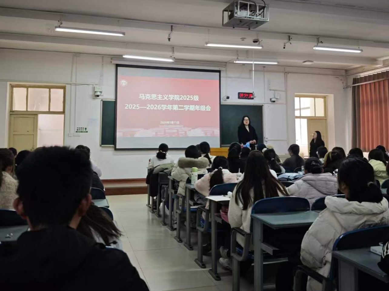 为深入落实立德树人根本任务,持续推进优良学风建设,激励2025级本科生在新学期锚定方向、蓄力前行,3月11日,马克思主义学院召开2025级本科生新学期年级会。学院2025级本科生辅导员张洁宜、班主任汤婉丽及2025级全体本科生参加会议,会议由2025级本科生辅导员张洁宜主持。