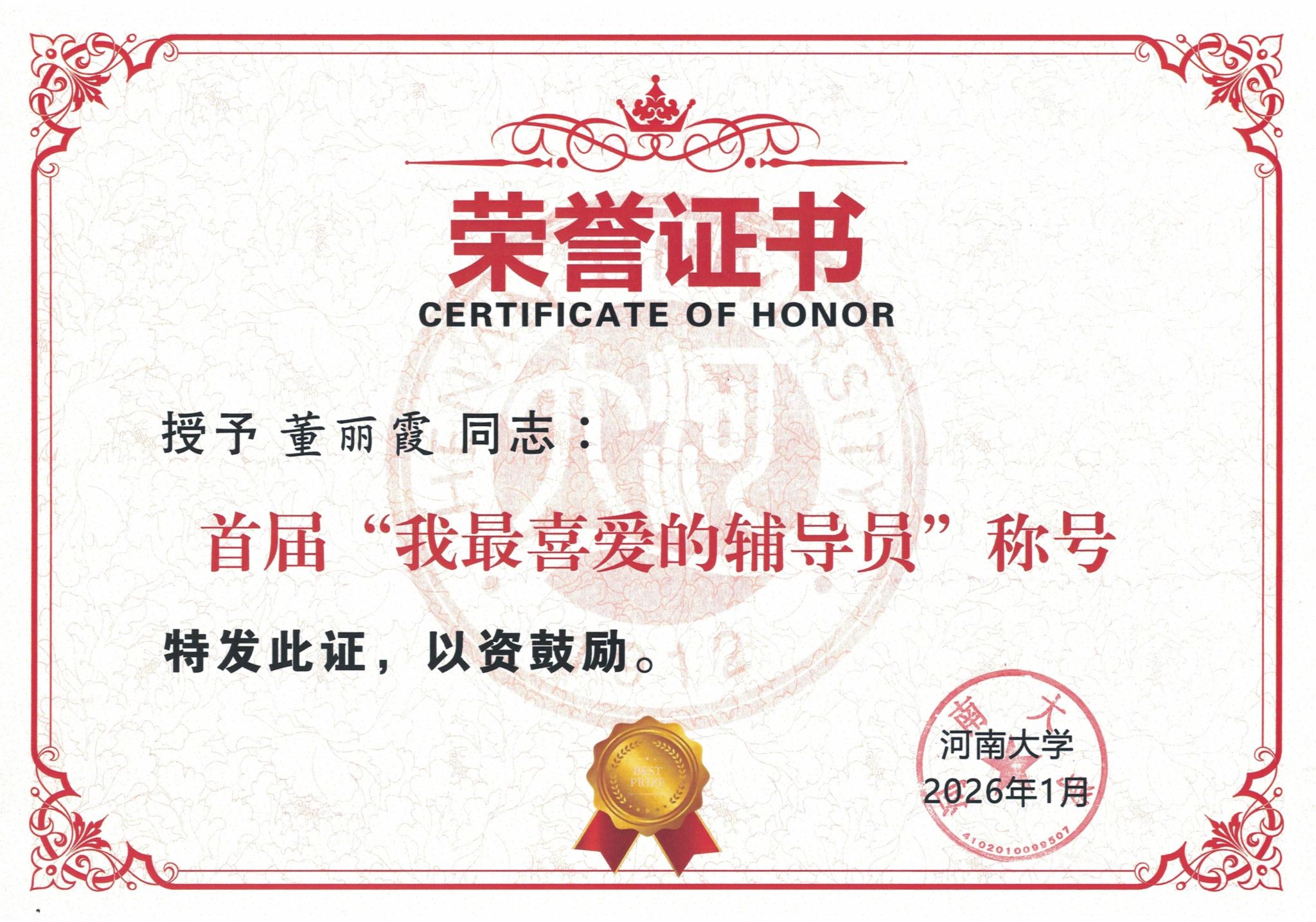 3月25日下午,河南大学在金明校区行政楼249会议室召开2026年度学生工作会议。会上对2025年度在学生工作领域取得突出成绩的先进集体与个人进行了表彰。我院荣获“2025年度河南大学学生工作先进集体”荣誉称号,2023级、2024级本科生辅导员董丽霞获评河南大学首届“我最喜爱的辅导员”。