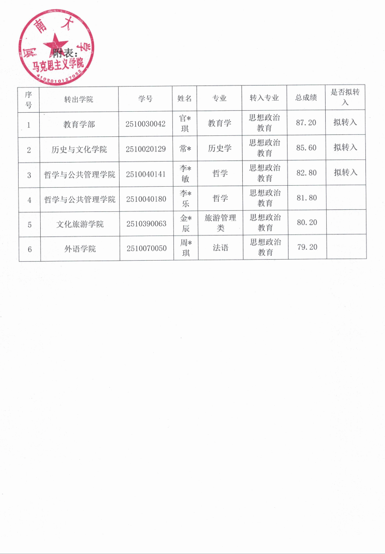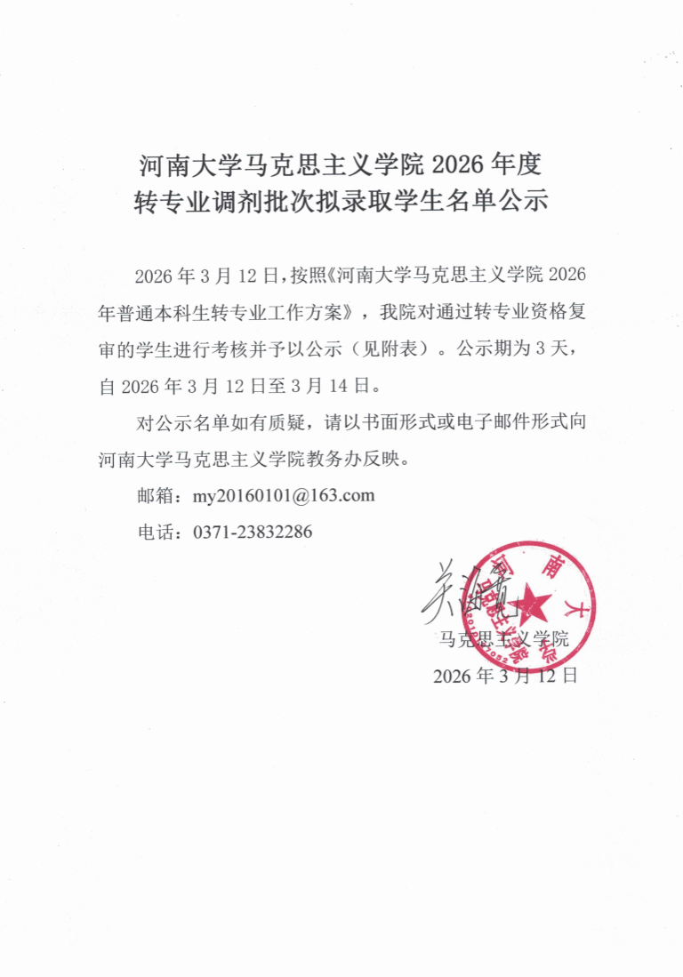 河南大学马克思主义学院2026年度转专业调剂批次拟录取学生名单公示